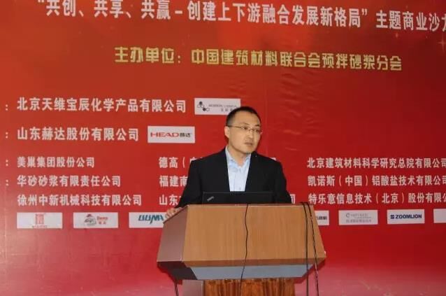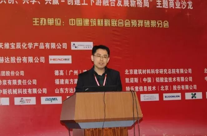 以“共創(chuàng)、共享、共贏-創(chuàng)建上下游融合發(fā)展新格局”為主題的商業(yè)沙龍由預(yù)拌砂漿分會(huì)副理事長、北京敬業(yè)達(dá)新型建材有限公司董事長張新主持。預(yù)拌砂漿分會(huì)會(huì)員單位、徐州中新機(jī)械科技有限公司總經(jīng)理權(quán)躍以“綠色環(huán)保智能特種砂漿工廠”為題首先進(jìn)行講解;預(yù)拌砂漿分會(huì)副理事長單位,北京金隅砂漿有限公司總經(jīng)理蔡魯宏則分享了“破解預(yù)拌砂漿發(fā)展困境的思考——最新行業(yè)政策解讀”;山東方達(dá)康工業(yè)纖維素有限公司總經(jīng)理馮文利則系統(tǒng)闡述了“羥丙基甲基纖維素的特性及在抹灰機(jī)噴砂漿中的應(yīng)用”。