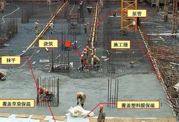 6、大體積泵送混凝土經(jīng)振搗后表面水泥漿較厚,容易引起表面裂縫。首先,要求在振搗最上一層混凝土?xí)r,控制振搗時間,注意避免表層產(chǎn)生太厚的浮漿層;在澆搗后,必須及時用2m 長括尺,將多余浮漿層刮除,按照標(biāo)高控制點,將混凝土表面括拍平整。有凹坑的部位必須用混凝土填平,在混凝土收漿接近初凝時,混凝土面進(jìn)行二次抹光,用木蟹全面仔細(xì)打抹兩遍,既要確?;炷恋钠秸?,又要把其初期表面的收縮脫水細(xì)縫閉合,在混凝土收漿凝固施工期間,除了具體施工人員外,不得在未干硬的混凝土面上隨意行走,收漿工作完成的面必須同步及時覆蓋薄膜。