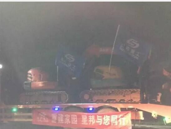 當(dāng)晚在重災(zāi)區(qū)壩塘鎮(zhèn),星邦重工組織的6臺挖機(jī)連夜運(yùn)到,同時到達(dá)的還有災(zāi)區(qū)急需的物資。