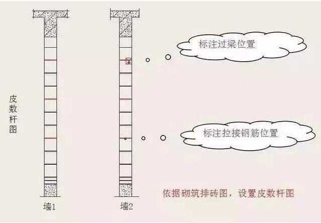 ( 2 )施工時(shí)在墻體轉(zhuǎn)角處立好皮數(shù)桿或利用混凝土墻柱做皮數(shù)桿,桿上標(biāo)明塊層、灰縫、窗臺(tái)板、門(mén)窗洞口、過(guò)梁、圈梁、預(yù)制件等的高度及位置,并應(yīng)隨時(shí)檢查其準(zhǔn)確性。