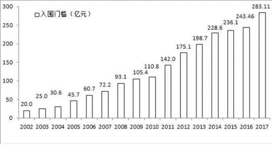 中國企業(yè)500強的入圍門檻及增幅(2002-2017)