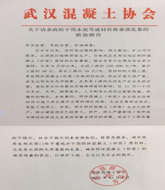 武漢混凝土協(xié)會(huì)網(wǎng)站4日發(fā)布《關(guān)于請(qǐng)求政府干預(yù)水泥等建材價(jià)格暴漲亂象的緊急報(bào)告》,《報(bào)告》表示,上游的水泥生產(chǎn)企業(yè)及供應(yīng)商借機(jī)夸大環(huán)保整治及錯(cuò)峰停窯的影響,僅11月有一個(gè)月內(nèi)多次、無(wú)序,隨意漲價(jià),人為制造水泥供應(yīng)緊張局面,涉嫌哄抬物價(jià),牟取暴利。因?yàn)閮r(jià)格原因無(wú)法正常保證混凝土(砂漿)的正常供應(yīng),部分建設(shè)項(xiàng)目已經(jīng)停工。