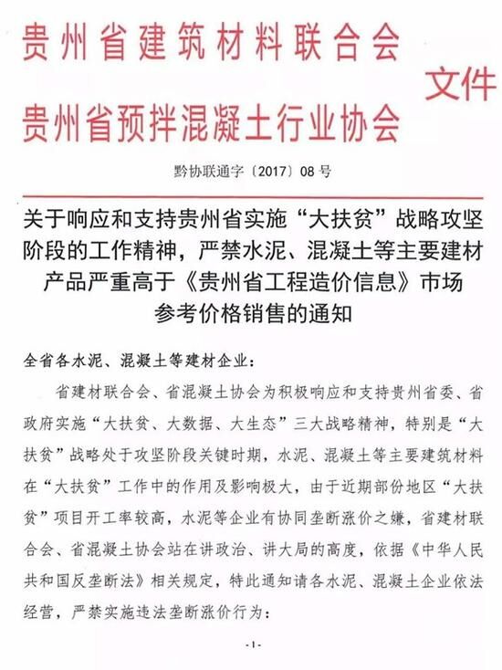 12月5日,貴州省建筑材料聯(lián)合會(huì)和貴州省預(yù)拌混凝土行業(yè)協(xié)會(huì)聯(lián)合發(fā)文《關(guān)于響應(yīng)和支持貴州省實(shí)施“大扶貧”戰(zhàn)略攻堅(jiān)階段的工作精神,嚴(yán)禁水泥、混凝土等主要建材產(chǎn)品嚴(yán)重高于<貴州省工程造價(jià)信息>市場(chǎng)參考價(jià)格銷售的通知》(黔協(xié)聯(lián)通字〔2017〕08號(hào))(下文稱為《通知》)。