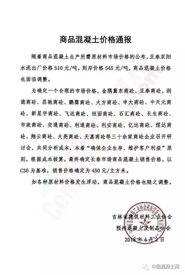 為確定一個(gè)合理的市場(chǎng)價(jià)格,金隅冀東商砼、亞泰商砼、潤(rùn)德商砼、昌馳商砼、鵬霖商砼、大方商砼、中天元商砼、新星宇商砼、飛達(dá)商砼、石匯商砼、長(zhǎng)生商砼、市政商砼、交通商砼、利通商砼、利安商砼、億達(dá)商砼、煜達(dá)商砼、翔云商砼、大亮商砼、天嘉商砼等三十余家商砼企業(yè)召開(kāi)研討會(huì),共同分析,本著“確保企業(yè)生存、維護(hù)客戶利益”原則,根據(jù)成本核算,最終確定長(zhǎng)春市場(chǎng)商品混凝土銷(xiāo)售價(jià)格,以C30為基準(zhǔn),銷(xiāo)售價(jià)格確定為450元/立方米。