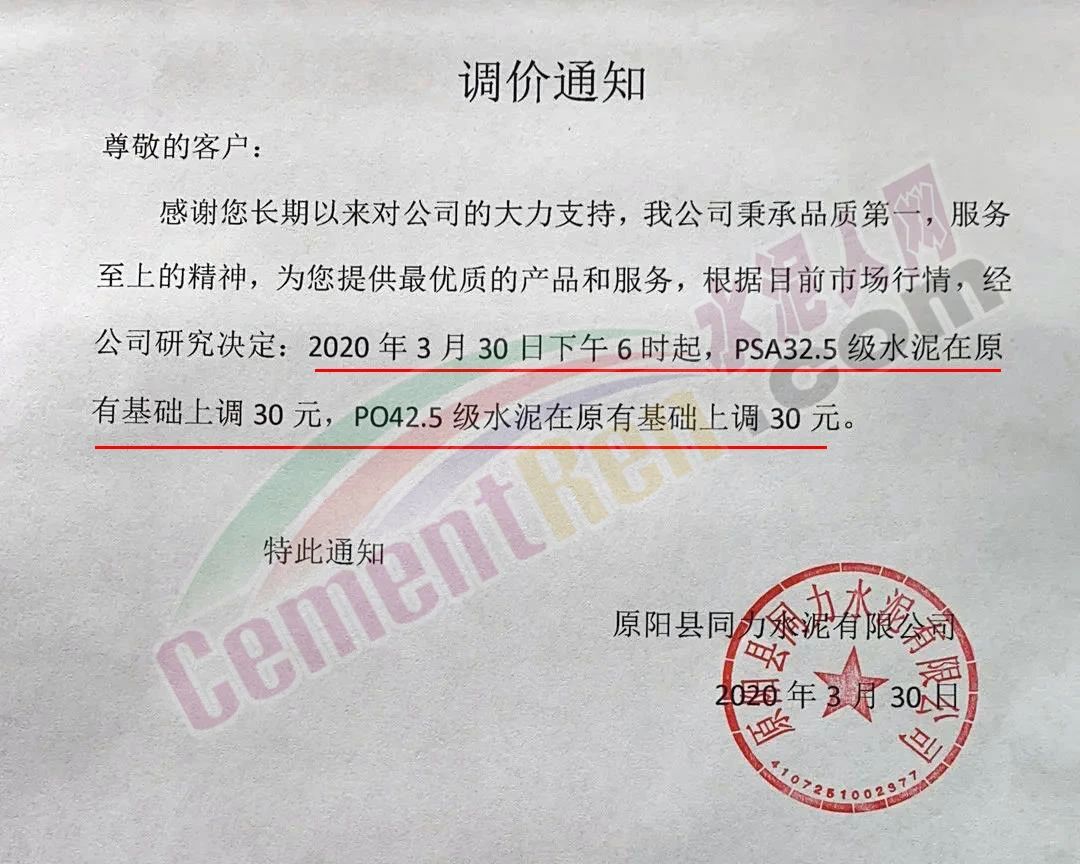 昨日(3月30日)原陽縣同力水泥有限公司發(fā)布調(diào)價(jià)通知稱:根據(jù)目前市場行情,經(jīng)公司研究決定:2020年3月30日下午6時(shí)起,PSA32.5級水泥在原有基礎(chǔ)上調(diào)30元,PO42.5級水泥在原有基礎(chǔ)上調(diào)30元。