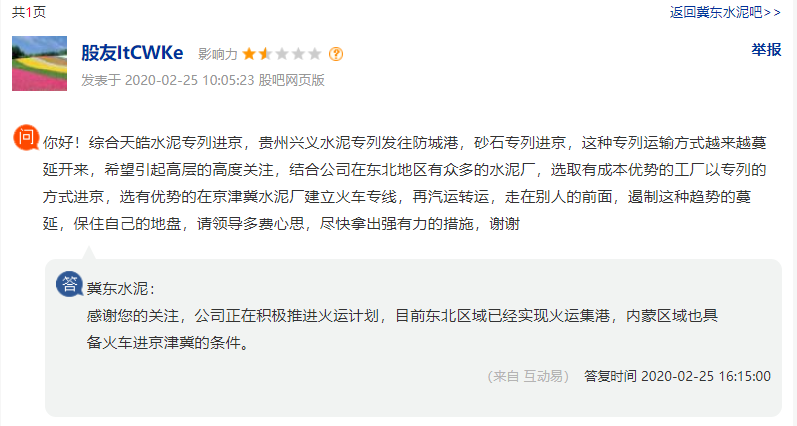 日前有股友在上市公司平臺向冀東水泥提問并建議:稱綜合天皓水泥專列進(jìn)京,貴州興義水泥專列發(fā)往防城港,砂石專列進(jìn)京,這種專列運(yùn)輸方式越來越蔓延開來,希望引起高層的高度關(guān)注。