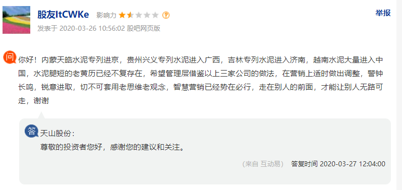 同期有投資者在上市平臺向天山股份董秘提問并建議說內(nèi)蒙天皓水泥專列進(jìn)京,貴州興義專列水泥進(jìn)入廣西,吉林專列水泥進(jìn)入濟(jì)南,越南水泥大量進(jìn)入中國,水泥腿短的老黃歷已經(jīng)不復(fù)存在,希望管理層借鑒以上三家公司的做法,在營銷上適時(shí)做出調(diào)整,警鐘長鳴,銳意進(jìn)取,切不可套用老思維老觀念,智慧營銷已經(jīng)勢在必行,走在別人的前面,才能讓別人無路可走。