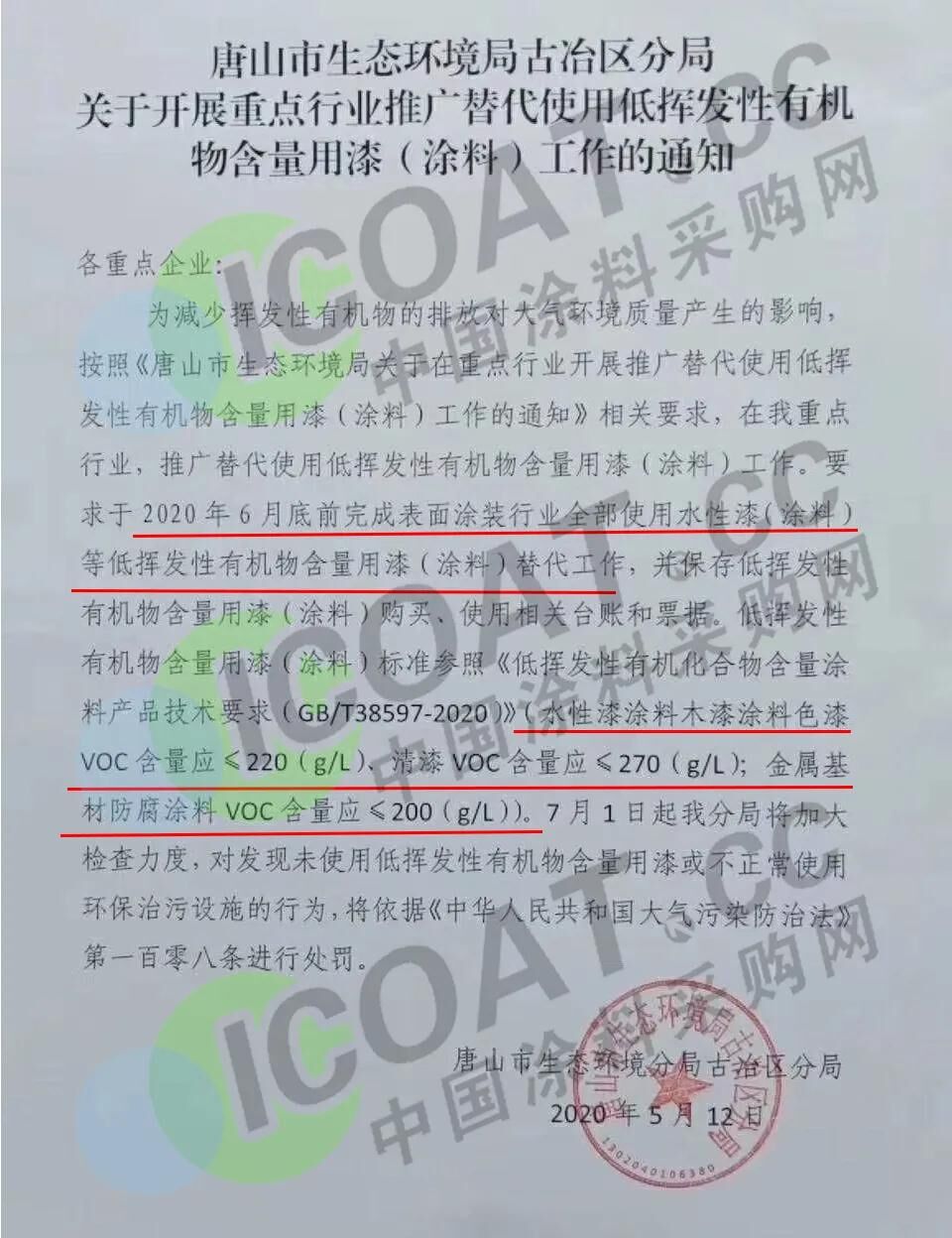 為減少揮發(fā)性有機(jī)物的排放對(duì)大氣環(huán)境質(zhì)量產(chǎn)生的影響,按照《唐山市生態(tài)環(huán)境局關(guān)于在重點(diǎn)行業(yè)開(kāi)展推廣替代使用低揮發(fā)性有機(jī)物含量用漆(涂料)工作的通知》相關(guān)要求,在我重點(diǎn)行業(yè),推廣替代使用低揮發(fā)性有機(jī)物含量用漆(涂料)工作,要求于2020年6月底前完成表面涂裝行業(yè)全部使用水性漆(涂料)等低揮發(fā)性有機(jī)物含量用漆(涂料)替代工作,并保存低揮發(fā)性有機(jī)物含量用漆(涂料)購(gòu)買、使用相關(guān)臺(tái)賬和票據(jù)。低揮發(fā)性有機(jī)物含量用漆(涂料)標(biāo)準(zhǔn)參照《低揮發(fā)性有機(jī)化合物含量涂料產(chǎn)品技術(shù)要求(GB/T38597-2020)》(水性漆涂料木漆涂料色漆VOC含量應(yīng)≤220(g/L)、清漆VOC含量應(yīng)≤270(g/L);金屬基材防腐涂料VOC含量應(yīng)≤200(g/L))。 7月1日起我分局將加大檢查力度,對(duì)發(fā)現(xiàn)未使用低揮發(fā)性有機(jī)物含量用漆或不正常使用環(huán)保治污設(shè)施的行為,將依據(jù)《中華人民共和國(guó)大氣污染防治法》第一百零八條進(jìn)行處罰。附:《中華人民共和國(guó)大氣污染防治法》第一百零八條??違反本法規(guī)定,有下列行為之一的,由縣級(jí)以上人民政府生態(tài)環(huán)境主管部門(mén)責(zé)令改正,處二萬(wàn)元以上二十萬(wàn)元以下的罰款;拒不改正的,責(zé)令停產(chǎn)整治:(一)產(chǎn)生含揮發(fā)性有機(jī)物廢氣的生產(chǎn)和服務(wù)活動(dòng),未在密閉空間或者設(shè)備中進(jìn)行,未按照規(guī)定安裝、使用污染防治設(shè)施,或者未采取減少?gòu)U氣排放措施的;(二)工業(yè)涂裝企業(yè)未使用低揮發(fā)性有機(jī)物含量涂料或者未建立、保存臺(tái)賬的;(三)石油、化工以及其他生產(chǎn)和使用有機(jī)溶劑的企業(yè),未采取措施對(duì)管道、設(shè)備進(jìn)行日常維護(hù)、維修,減少物料泄漏或者對(duì)泄漏的物料未及時(shí)收集處理的;(四)儲(chǔ)油儲(chǔ)氣庫(kù)、加油加氣站和油罐車、氣罐車等,未按照國(guó)家有關(guān)規(guī)定安裝并正常使用油氣回收裝置的;(五)鋼鐵、建材、有色金屬、石油、化工、制藥、礦產(chǎn)開(kāi)采等企業(yè),未采取集中收集處理、密閉、圍擋、遮蓋、清掃、灑水等措施,控制、減少粉塵和氣態(tài)污染物排放的;(六)工業(yè)生產(chǎn)、垃圾填埋或者其他活動(dòng)中產(chǎn)生的可燃性氣體未回收利用,不具備回收利用條件未進(jìn)行防治污染處理,或者可燃性氣體回收利用裝置不能正常作業(yè),未及時(shí)修復(fù)或者更新的。