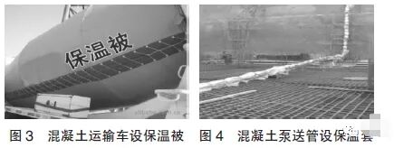 4.5.2對混凝土運輸車、輸送泵管采取隔熱措施,對混凝土運輸車采取保溫(如圖3)、輸送泵管采取包裹措施(如圖4)避免熱輻射傳導,降低罐內(nèi)管內(nèi)溫度,減少因罐壁及管壁溫度升高而造成對混凝土水分的蒸發(fā)及其對坍落度和強度的影響。