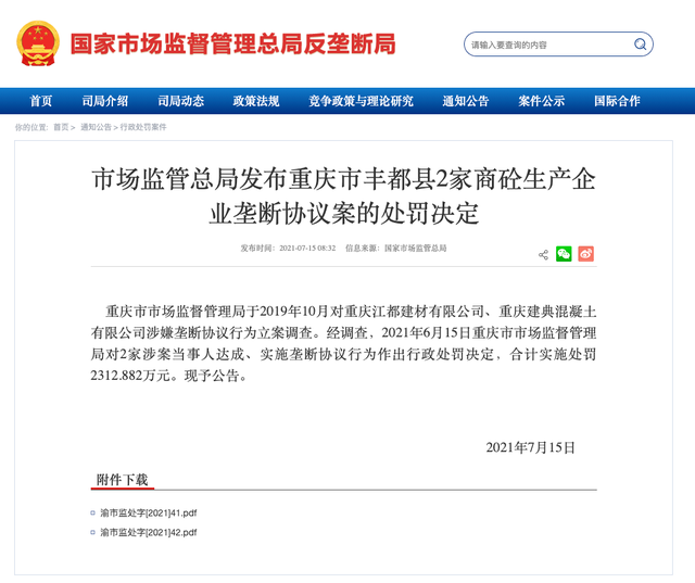 2021年7月15日,市場監(jiān)管總局發(fā)布重慶市豐都縣2家商砼生產(chǎn)企業(yè)壟斷協(xié)議案的處罰決定。處罰決定顯示,合計實施處罰2312.882萬元。
