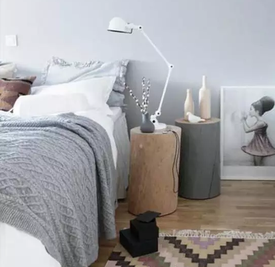床頭柜選擇了兩個木墩,在家里頗有原木的氣息,舍棄了床頭板的設計,沒有一絲繁縟的感覺,翻來覆去更加自在。