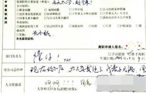 部門負(fù)責(zé)人回復(fù):“懂你,TAT”;分公司總經(jīng)理回復(fù):“現(xiàn)在的90后,太不負(fù)責(zé)任了,我表示無語。同意”;人力資源部回復(fù):“呵呵?。。⊥狻?。