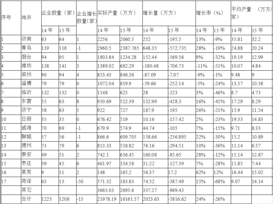 山東省2015年17地市預(yù)拌混凝土生產(chǎn)企業(yè)及產(chǎn)量統(tǒng)計(jì)對(duì)比表