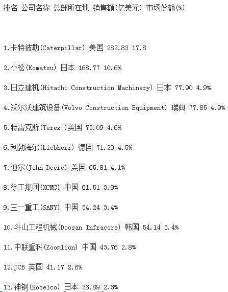 從表單中不難看出,卡特彼勒、小松的世界排名相對(duì)穩(wěn)定,仍然位居第一、第二名。其中卡特彼勒占總市場(chǎng)收入的18.1%。較之2015年,特雷克斯上升兩個(gè)名次,位居第三位。特雷克斯取代日立排名第三,日立建機(jī)排名第四,利勃海爾位列第五,沃爾沃排名第六。除此之外,斗山和杰西博分別上升兩個(gè)名次,擠進(jìn)前十名。
