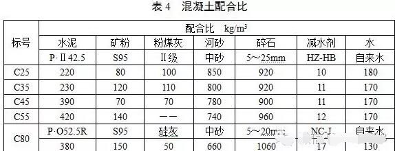 各標號混凝土工作性能良好,坍落度在180mm~210mm之間,無離析、泌水現(xiàn)象,各標號混凝土配合比如表4所示。