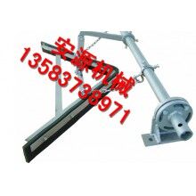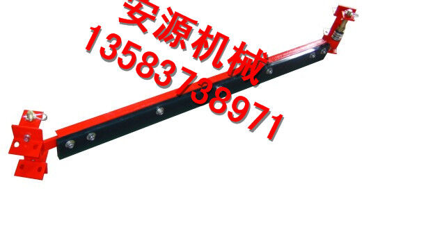 在正機安裝時,首先確定好安裝位置,將前吊桿焊在清掃器三角板上,再將橫粱焊在機架上,前吊桿調(diào)正螺絲頂在橫梁上,調(diào)正刮板與膠帶距離,后吊環(huán)角鐵焊在機架槽綱下面,吊著清掃器尾部,自動調(diào)正清掃器