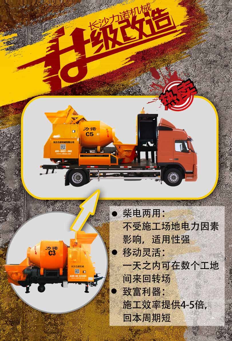 柴電兩用不受場(chǎng)地電量影響。操作簡(jiǎn)單,一人操作整機(jī),解決雇人難,降低勞動(dòng)強(qiáng)度,讓混凝土更高,更遠(yuǎn),更安全的輸送。增加汽車底盤,轉(zhuǎn)場(chǎng)更方便,維修更簡(jiǎn)單。