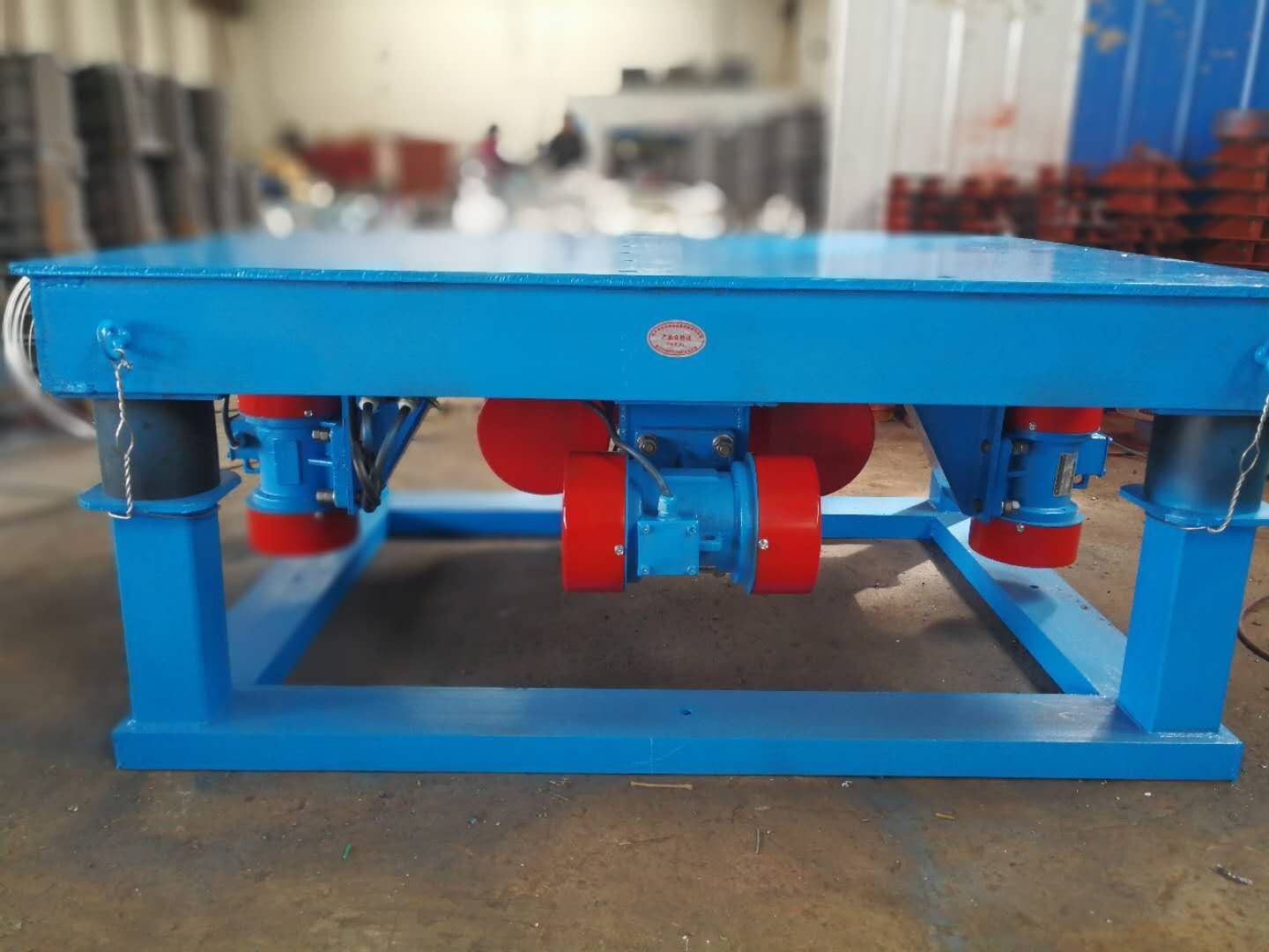 混凝土振動(dòng)臺(tái)主要由臺(tái)底架、振動(dòng)器彈簧等部件組成,臺(tái)面與底架均用鋼板和型鋼焊接而成,振動(dòng)臺(tái)是用電動(dòng)機(jī)加一對(duì)相同的偏心輪組成。并通過(guò)一對(duì)吊架聯(lián)軸器安裝在臺(tái)面(反面)中心位置,起著振實(shí)過(guò)程中平穩(wěn)、垂直方向的作用。本儀器專供實(shí)驗(yàn)室內(nèi)震實(shí)成型混凝土試件及制品之用。