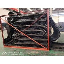 大傾角擋邊輸送帶的基帶是由上覆蓋膠、下覆蓋膠、帶芯和橫向剛性層四部分組成。上覆蓋膠厚度一般為3-6mm;下覆蓋膠厚度一般為1.5-4.5mm,帶芯材料承受拉力,其材料可以是棉帆布(CC)、尼龍帆布(NN)、聚酯帆布(EP)或鋼繩芯(ST)。為了增加基帶的橫行剛性,在芯體上下添加特殊加強(qiáng)層,稱(chēng)橫向剛性層?;鶐У膶挾纫?guī)格,與普通膠帶相同,符合GB7984-2001的標(biāo)準(zhǔn)規(guī)定。