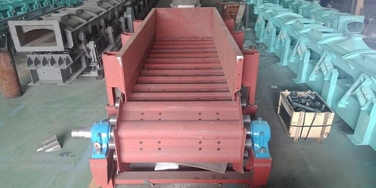 前期使用的給料機采用步進(jìn)給料機構(gòu),由于料斗膨料、步進(jìn)行程小等因素,導(dǎo)致勻料機勻料效果較差。雖經(jīng)多次改進(jìn),由于結(jié)構(gòu)限制,勻料基本上是靠抓斗間歇式投放進(jìn)行勻料,降低了生產(chǎn)線處理效率。