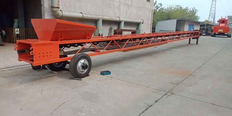 首先將布料桁架放下,在桁架前端用安全凳墊好;依次拆下附件(油管、電氣)、上料膠帶機、主機受料斗、配重、油缸、布料膠帶機、三角支架等。