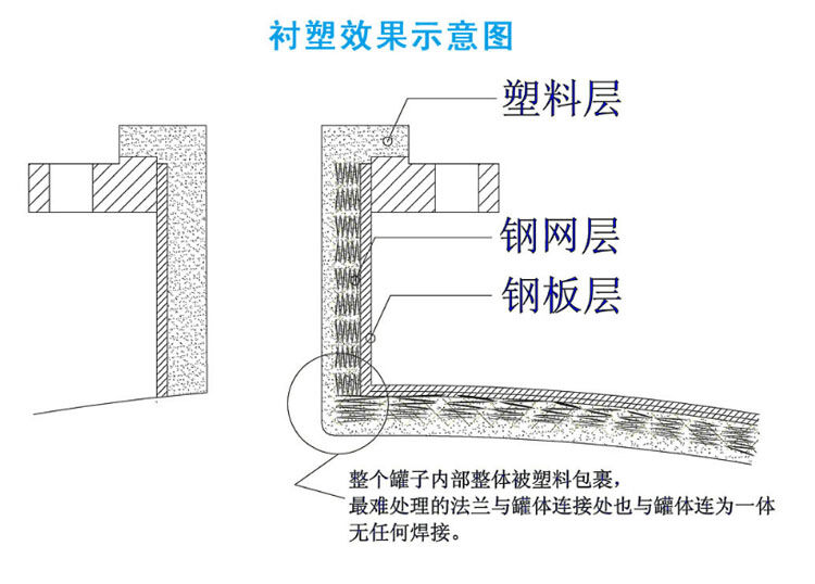 鋼襯塑聚乙烯儲罐:以純聚乙烯(PE)為原料,使用熱融滾塑工藝將聚乙烯內(nèi)襯于鋼罐體內(nèi)壁,鋼罐體內(nèi)網(wǎng)(龜甲)與聚乙烯有機(jī)結(jié)合成一體,使聚乙烯牢固過渡連接鋼體內(nèi)表面,內(nèi)襯聚乙烯防腐層厚度可根據(jù)實(shí)際需要而定,內(nèi)襯聚乙烯防腐層厚度可在15-25mm不等。