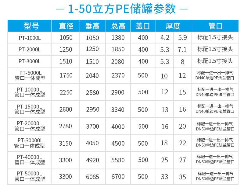 管口:管口一體成型,質(zhì)保兩年,標配一進一出一排氣DN50單邊PE法蘭管口。