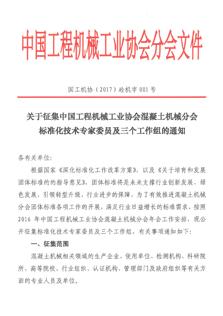 關(guān)于征集中國工程機械工業(yè)協(xié)會混凝土機械分會標(biāo)準(zhǔn)化技術(shù)專家委員及三個工作組的通知